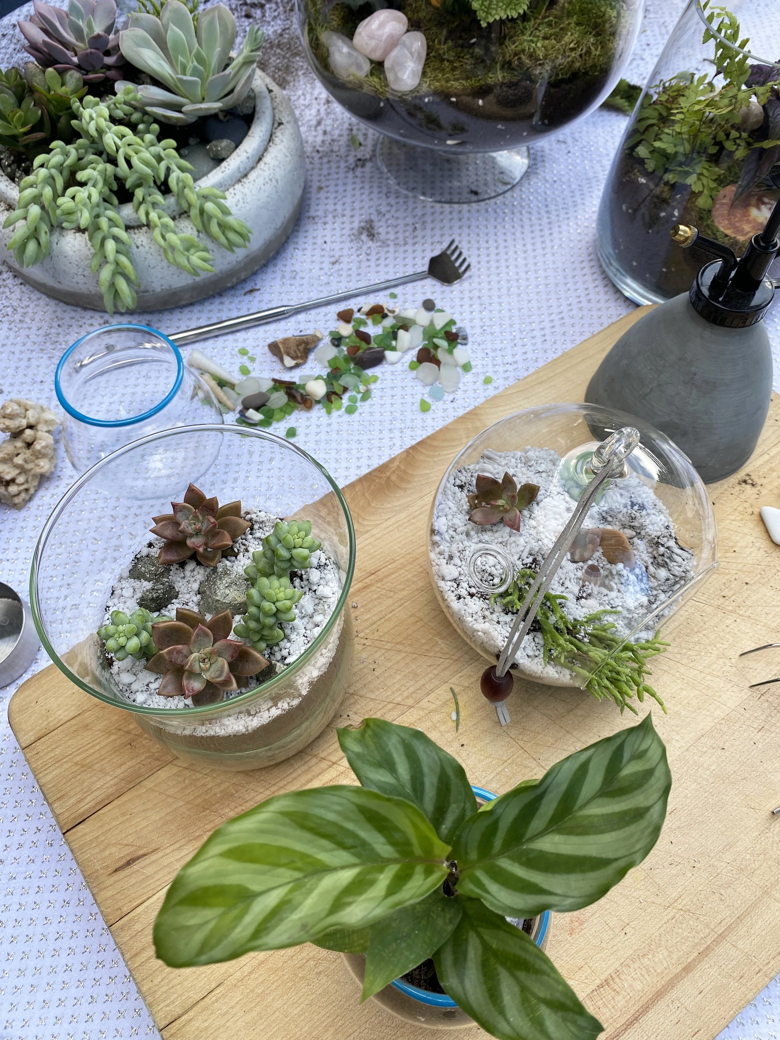 I know there are great benefits to being outside and playing in the dirt, and I am trying to be more intentional about carving out time to be in nature each day. I do not know why it has felt harder for me than it should be. About halfway through my chemotherapy treatments — a friend stopped by with some plants, glassware, rocks, and guided me outside to play. Now, I would like to invite you to carve out some time of your own, play in the dirt, and make your own terrarium in six simple steps.